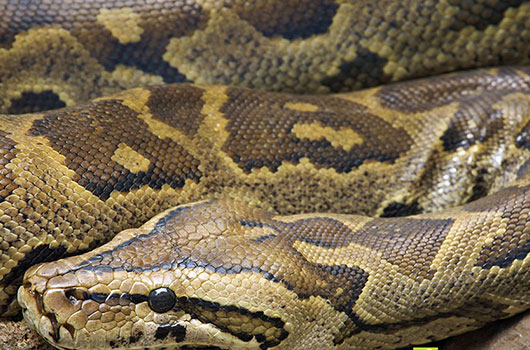 Le python réticulé est une espèce magnifique ; sa peau est dans les tons de camel, avec des motifs en forme de losanges parfaitement soulignés de noir. Il est l’un des plus grands serpents de l’espèce des pythons. Il peut mesurer jusqu’à 9 m et peser 140 kg, mais il adore à se recroqueviller, enroulé sur lui-même, formant un cercle compact et dense. Sa tête assez plate, ornée de trois bandes noires lui donne un air terrifiant.